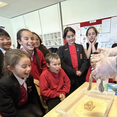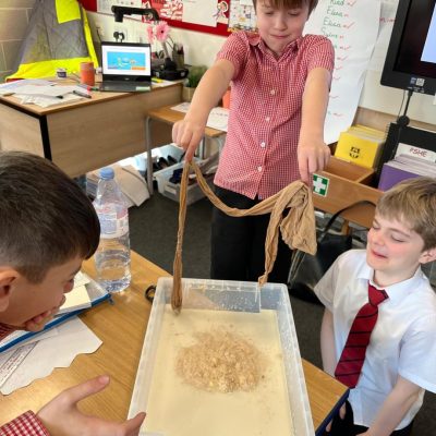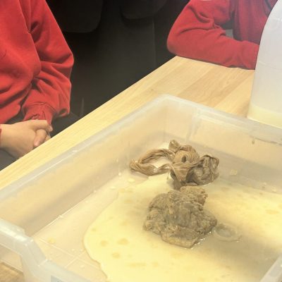 We also explored how the human digestive system works, looking at how food travels from our mouths to the toilet. Using banana, rich tea and orange juice we modelled how our food travels through the intestines (a pair of tights) and we watched how it came out the other side once all the nutrients have been absorbed by the body. The human body is extremely fascinating!