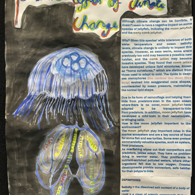 As well as the impressive scientific knowledge on display there was a rich display of colour and creativity; collage, watercolours, cartoon and mixed media were all used with great effect to communicate the messages of change and adaptation.