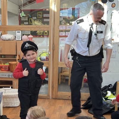 A visit from a firefighter taught the children about fire safety and how firefighters help in emergencies. Meeting police officers also helped the children learn about staying safe and how the police support our community.