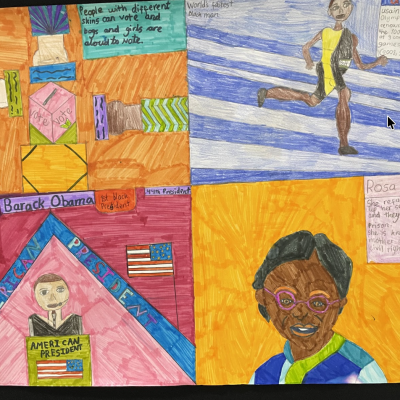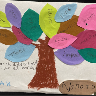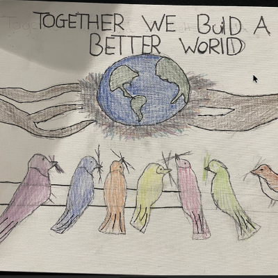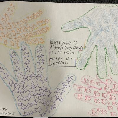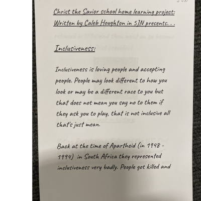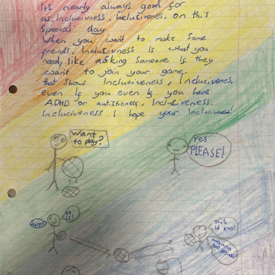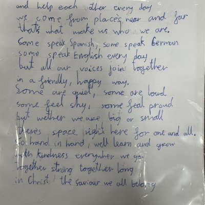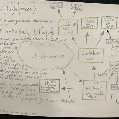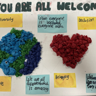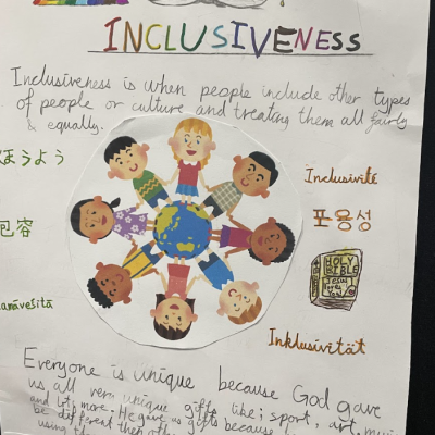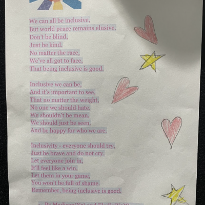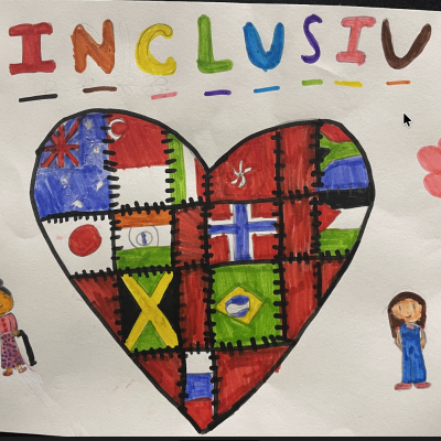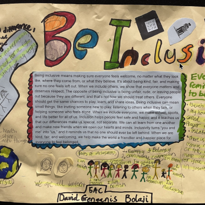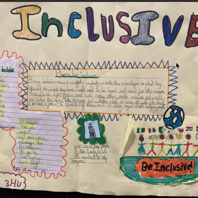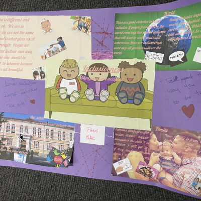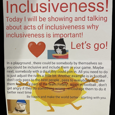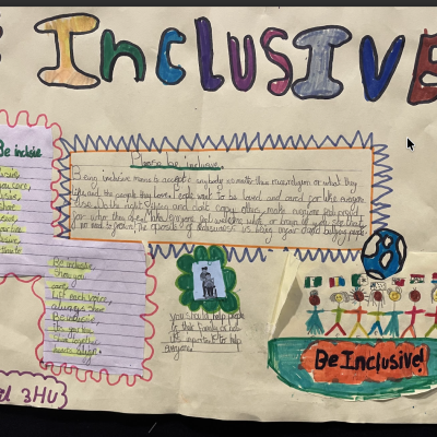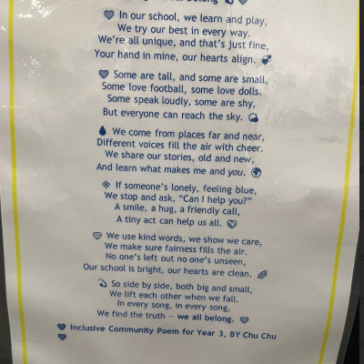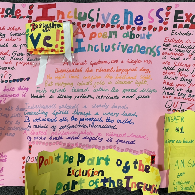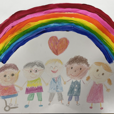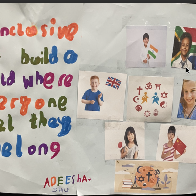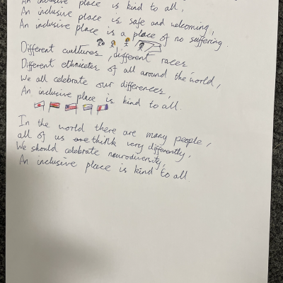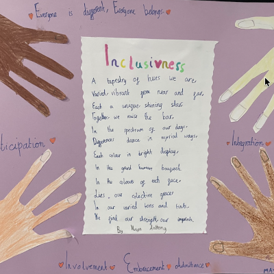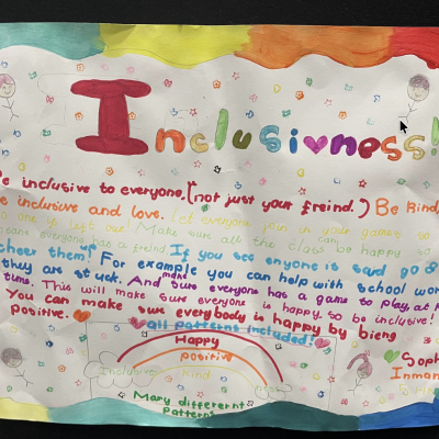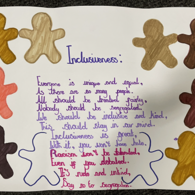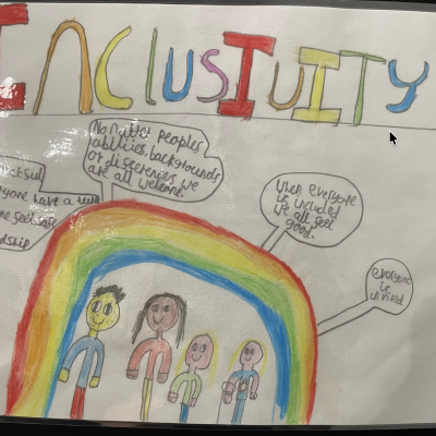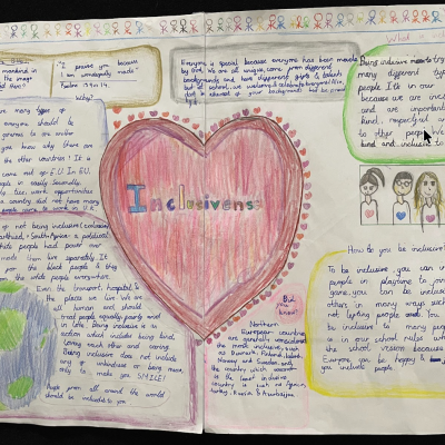The theme of inclusivesness resulted in a wide ranging set of projects that explored anti-racism, learning needs like dyslexia and disability and the theme of children coming to our school from all over the world. The inclusive theme inspired some beautiful art work and poetry; the acrostic poem on the theme of community by Ritsuto in Year 3 summarised many of the childrens thoughts and reflections so well: