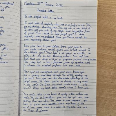 “I felt that the poem was very emotional, which set us up for writing emotive language. I found the emotive letter a tiny bit difficult, for example the repetition. However, when I finished I was happy with my work. I tried my best and it felt good afterwards.” – Daniel 5AJ